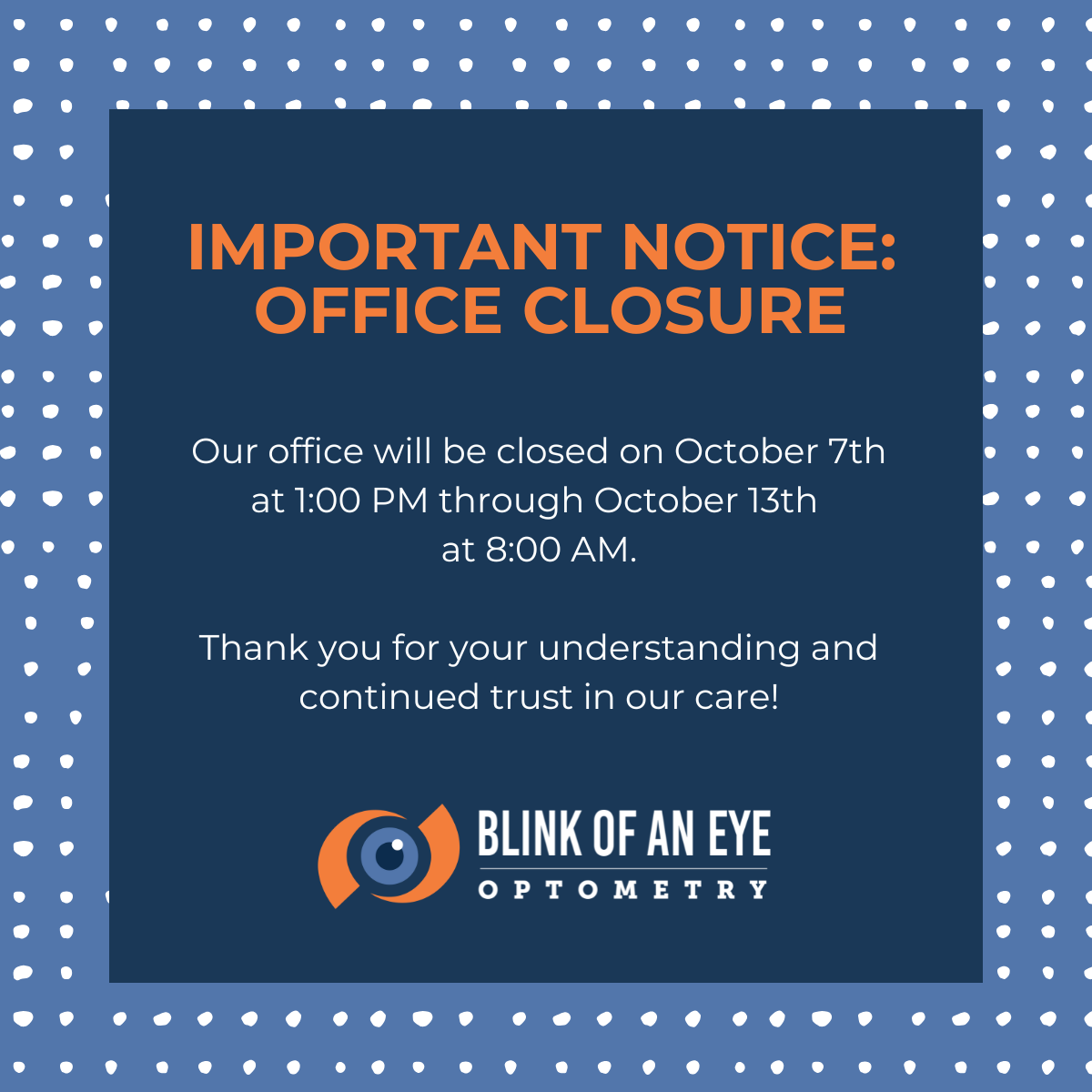 Roya1234 none 8:15 AM - 5:00 PM 8:15 AM - 5:00 PM 8:15 AM - 5:00 PM 8:15 AM - 5:00 PM 8:15 AM - 4:15 PM Closed Closed optometrist https://search.google.com/local/writereview?placeid=ChIJv8txmpT5Y4gR5iC2l5paW0Q https://www.facebook.com/Blink-of-an-Eye-Optometry-103982044816498/reviews/?ref=page_internal https://www.4patientcare.ws/wsv3pro/web/webschedulerv3.aspx?SessionID=14384829&Gcount=0 https://www.royacdn.com/unsafe/smart/Site-e97b56cc-eec3-4424-b257-da40f18ce82a/Blink_Of_An_Eye_Optometry_October_Office_Closure.png